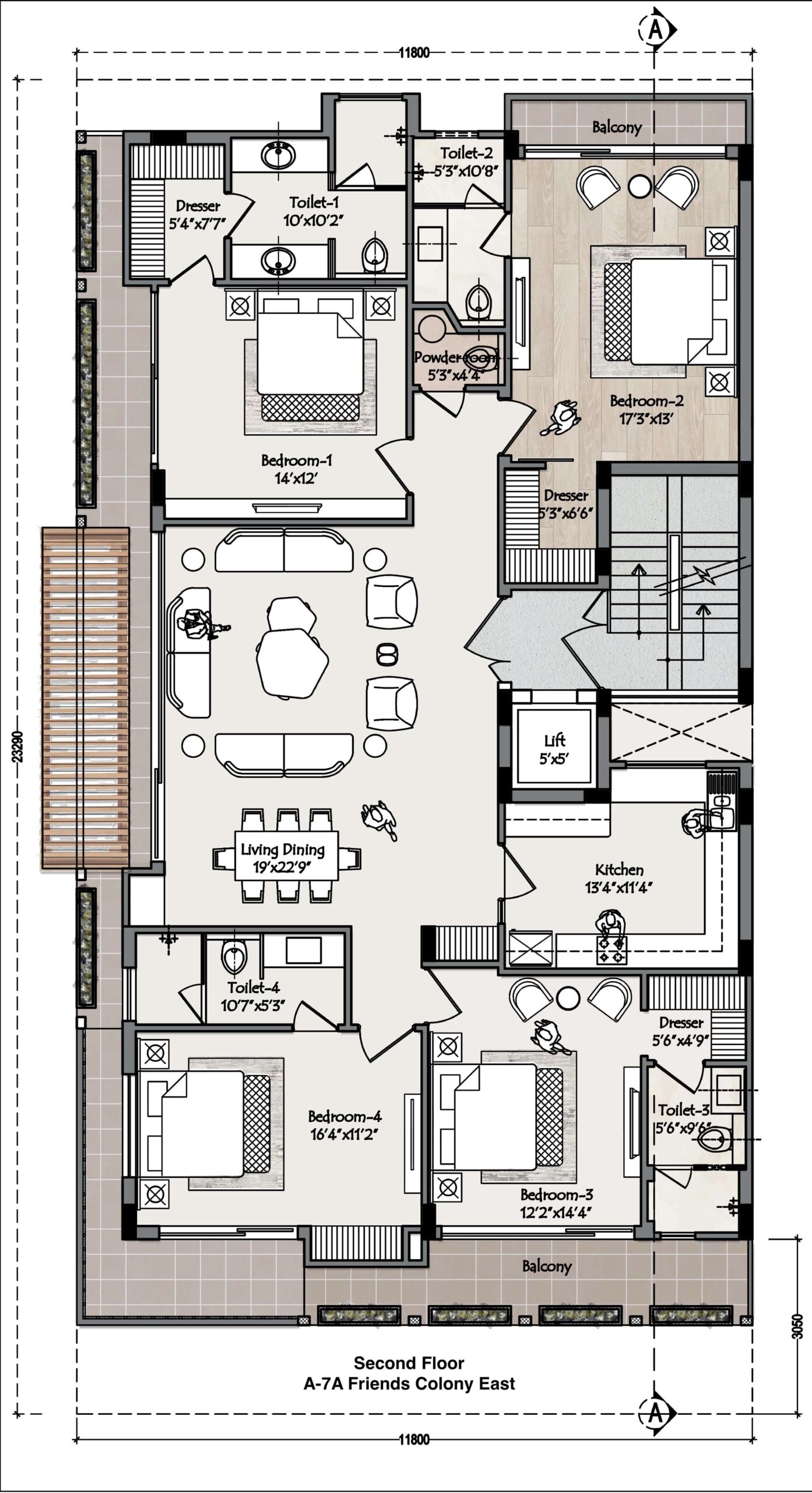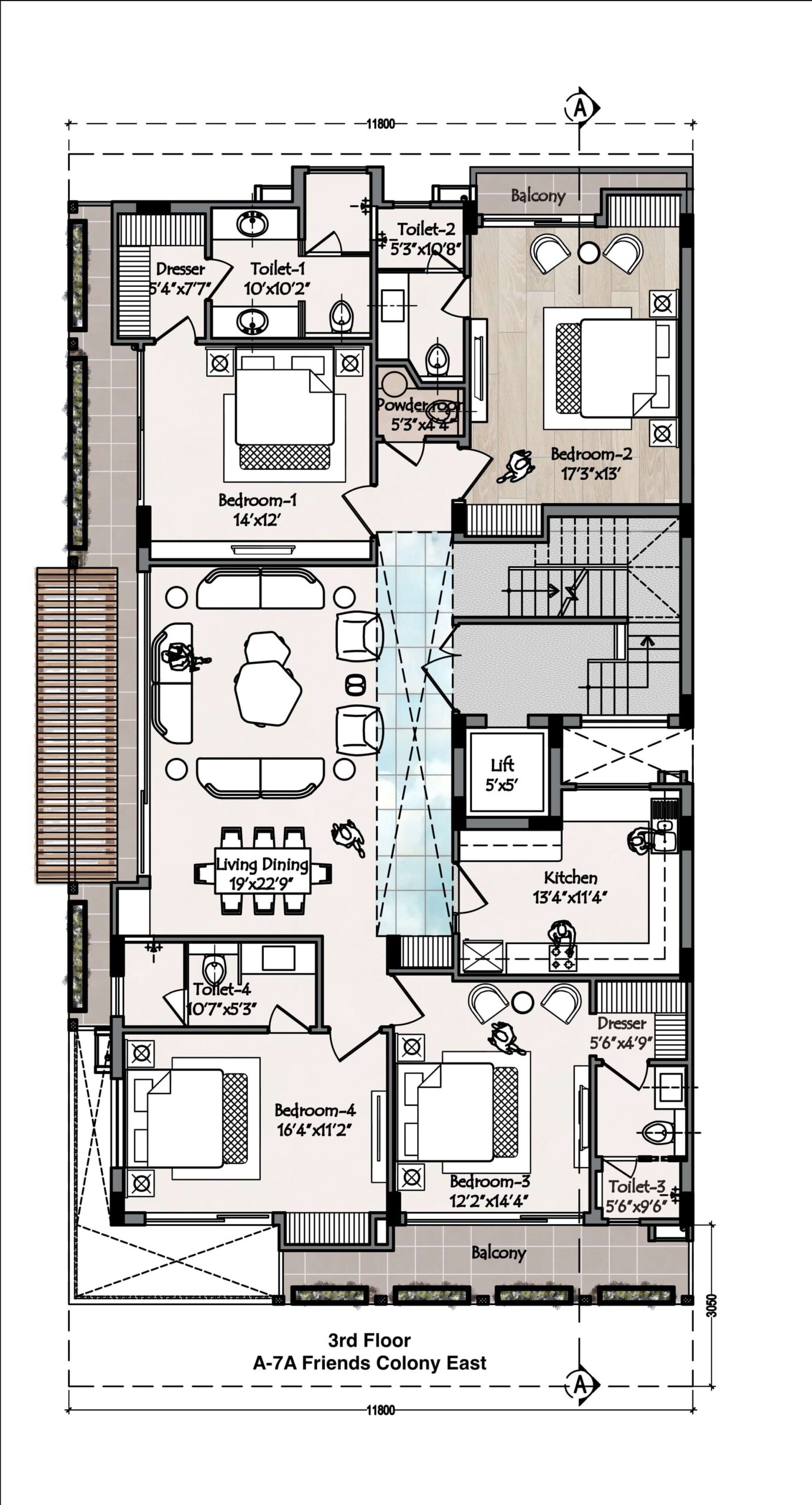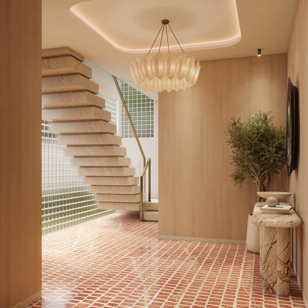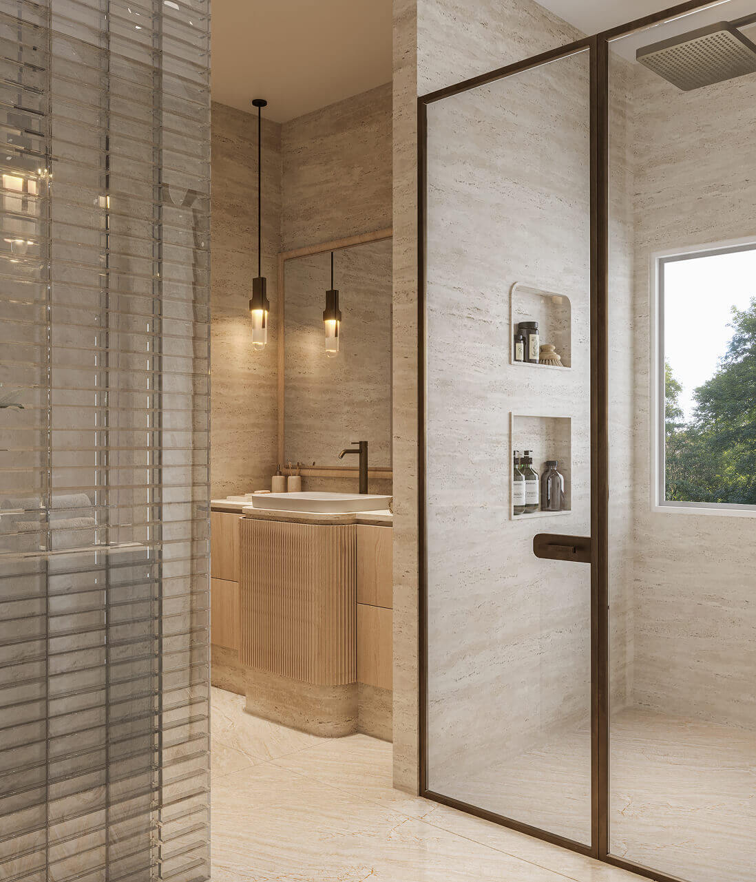 Set at the end of a leafy cul-de-sac in Friends Colony East, A-7A redefines luxury living through a thoughtful interpretation of Tropical Modernism. Inspired by Geoffrey Bawa’s timeless architectural philosophy, each home invites cross-breezes through sloped ceilings and parallel windows, opening onto garden views. A private terrace offers an additional sanctuary; an oasis of calm in the heart of the city.